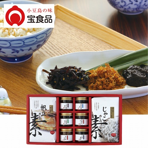 ●内容:帆立めしの素・じゃこめしの素 各230g、伊勢志摩のり・小豆島生のり 各60g、しその実若布・ごま昆布 各40g、子持ち木くらげ30g、かつお生姜35g