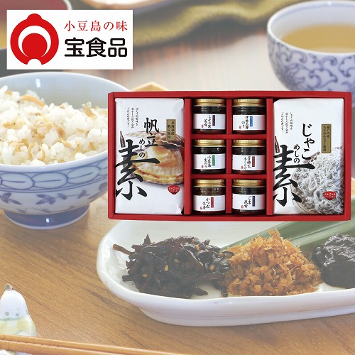 ●内容:帆立めしの素・じゃこめしの素 各230g、伊勢志摩のり・小豆島生のり 各60g、しその実若布・ごま昆布 各40g、子持ち木くらげ30g、かつお生姜35g