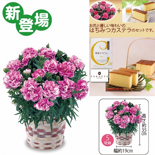 ●内容:カーネーション「ファンシーバイオレット」5号鉢、バスケット、育て方のしおり 、はちみつカステラ(5切れ)