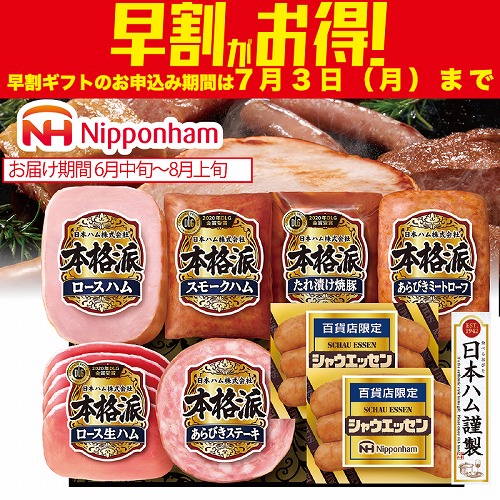 ●内容:ロースハム170g、スモークハム160g、たれ漬け焼豚170g、あらびきミートローフ135g、ロース生ハム27g、あらびきステーキ75g、百貨店限定シャウエッセン80g×2