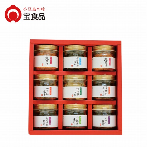 ●内容:鮭茶漬40g×2、伊勢志摩のり・小豆島生のり 各60g、竹の子山椒45g、しその実若布・ごま昆布 各40g、かつお生姜35g、子持ち木くらげ30g