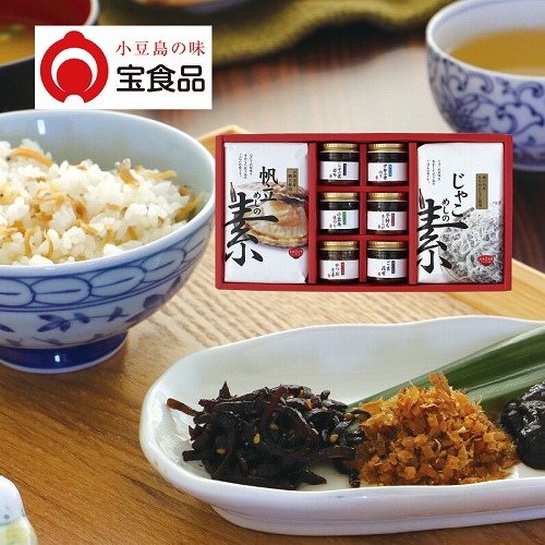 ●内容:帆立めしの素・じゃこめしの素 各230g、伊勢志摩のり・小豆島生のり 各60g、しその実若布・ごま昆布 各40g、子持ち木くらげ30g、かつお生姜35g