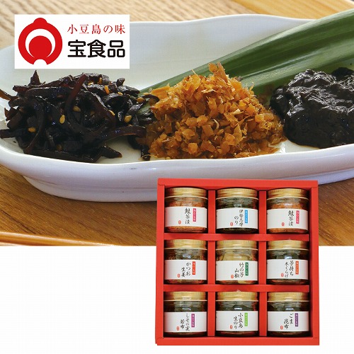 ●内容:鮭茶漬40g×2、伊勢志摩のり・小豆島生のり 各60g、竹の子山椒45g、しその実若布・ごま昆布 各40g、かつお生姜35g、子持ち木くらげ30g
