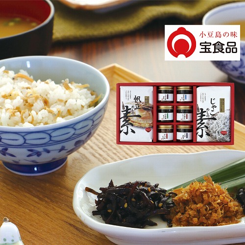 ●内容:帆立めしの素・じゃこめしの素 各230g、伊勢志摩のり・小豆島生のり 各60g、しその実若布・ごま昆布 各40g、子持ち木くらげ30g、かつお生姜35g