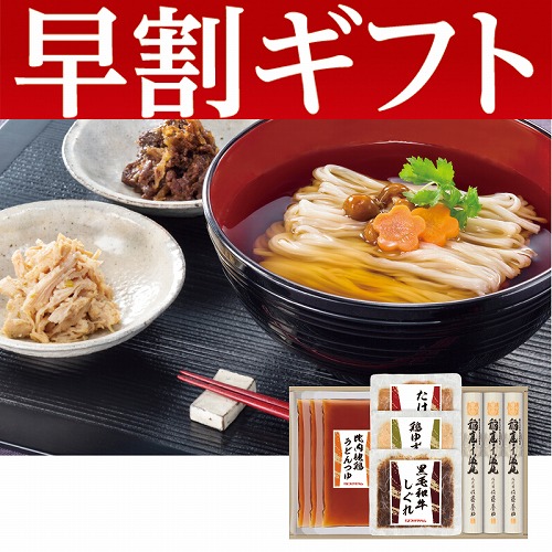 ●内容:稲庭うどん80g×3、黒毛和牛しぐれ・鶏ゆず胡椒・たけのこ旨煮 各60g、比内地鶏うどんつゆ150g×3