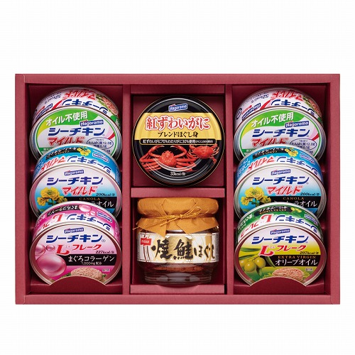 ●内容:オイル不使用シーチキンマイルド・シーチキンマイルドキャノーラオイル 各70g×2、シーチキンLフレークコラーゲン入り・シーチキンLフレークオリーブオイル 各70g、紅ずわいがにブレンドほぐし身55g、ニッスイ焼鮭ほぐし50g