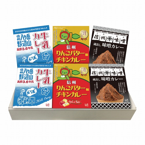 ●内容:信州八ヶ岳野辺山高原牛乳カレー・信州りんごバター味チキンカレー・信州蔵出し味噌カレー 各180g×2