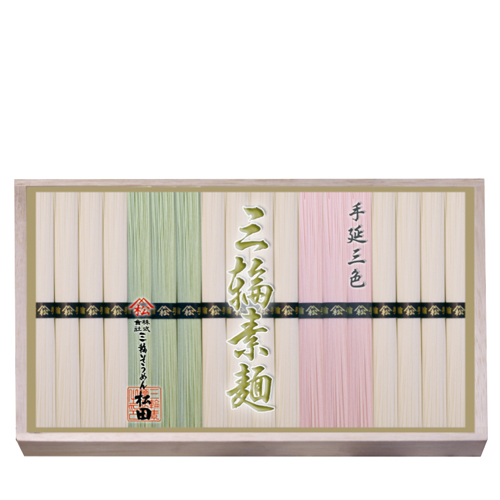 ●内容:三輪の糸(並麺)50g×12、抹茶麺・桜麺 各50g×3(木箱入)